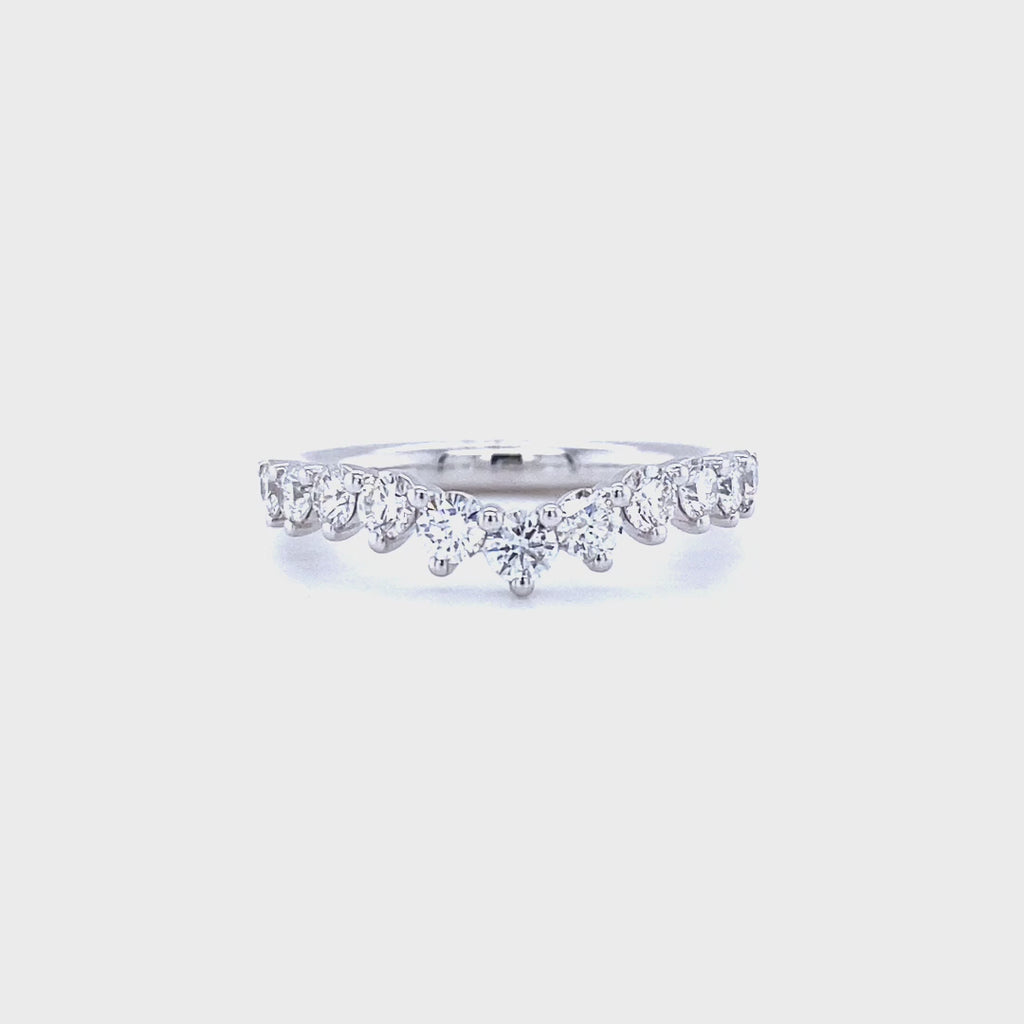 This 14-karat white gold A. Jaffe diamond wedding ring features a chevron profile prong set with round diamonds across the top of the shank. The (11) diamonds have a combined weight of 0.72 carat and characteristics of G color and SI clarity. Finger size 6. Stamped "14K".