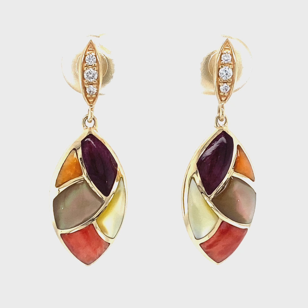 0.08 tdw Multi Mother Of Pearl & Spiny Oyster Dangle Earrings 14K Yellow Gold.