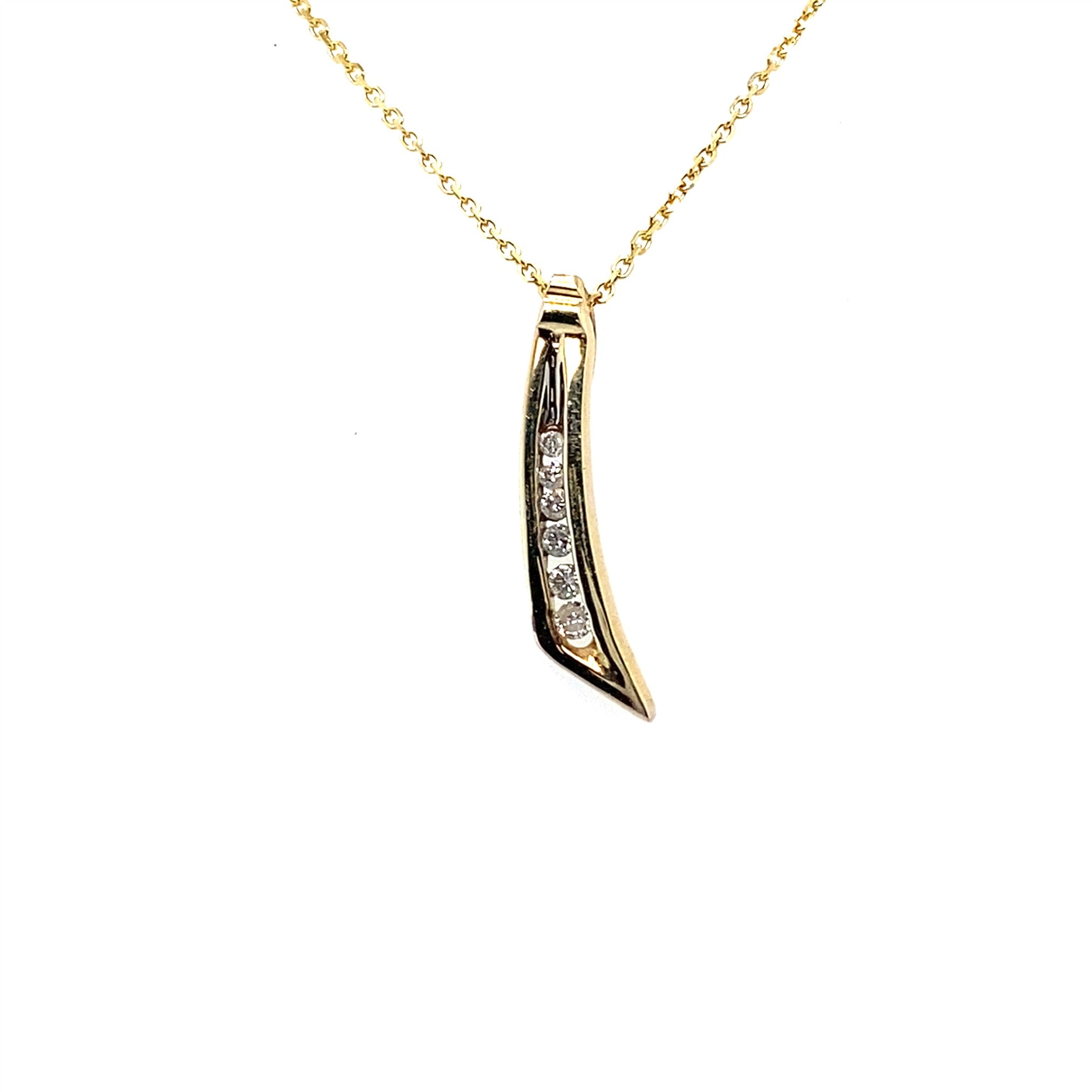 This 14-karat yellow gold necklace features a pendant with (6) channel-set round diamonds measuring between 1.80 to 1.60mm. The total diamond weight is approximately 0.14 carats with quality characteristics G/H color and SI clarity. The pendant is mounted on a 1.00 mm cablechain measuring 16”. Stamped "14K".