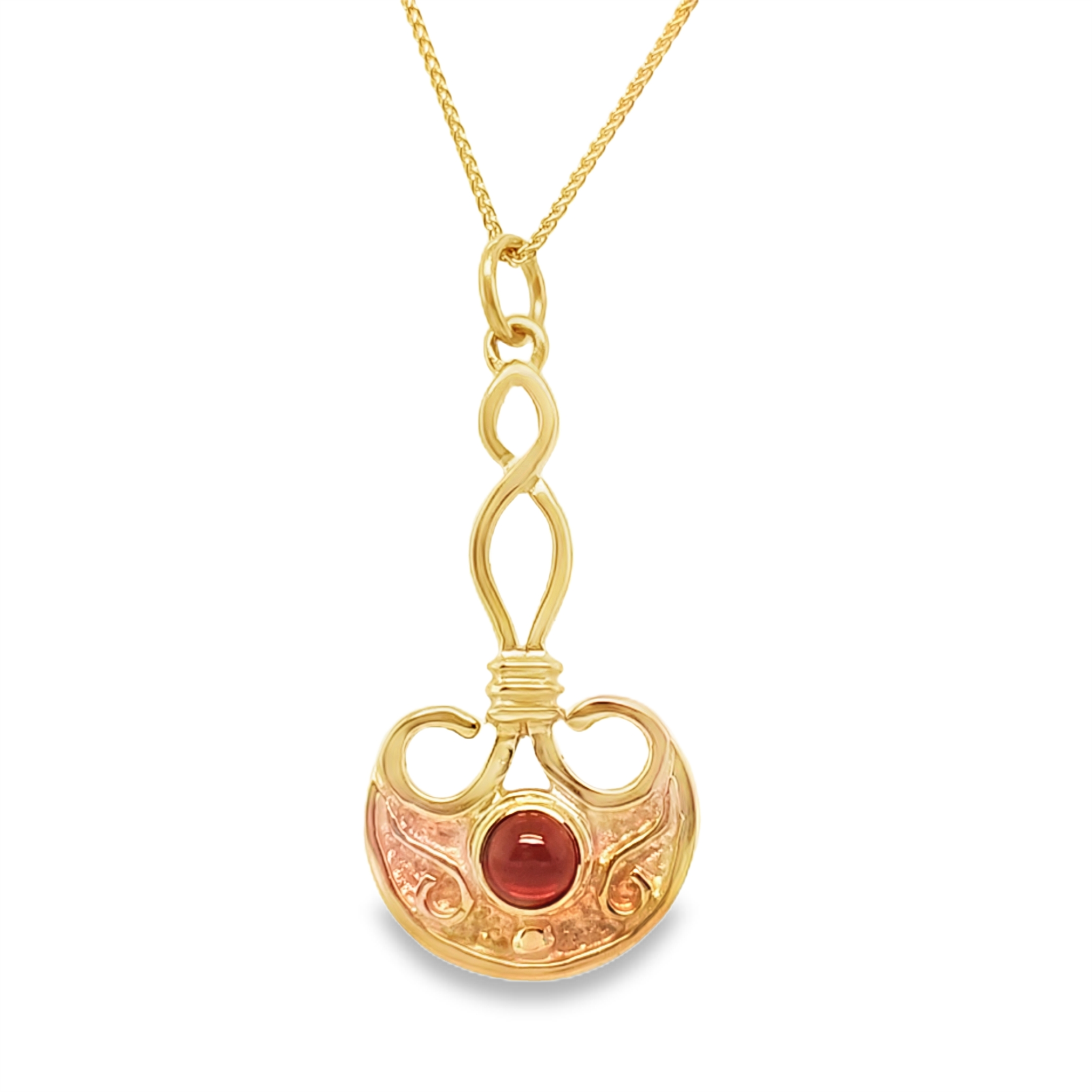 This 14 karat medallion pendant features a Turkman design style with (1) round 5.15 mm Mozambique garnet cabochon bezel set in the center profile. The medallion has measurements of 13.85 mm x 19.00 mm and is fashioned with a jump ring style bail. Stamped “14K”.
