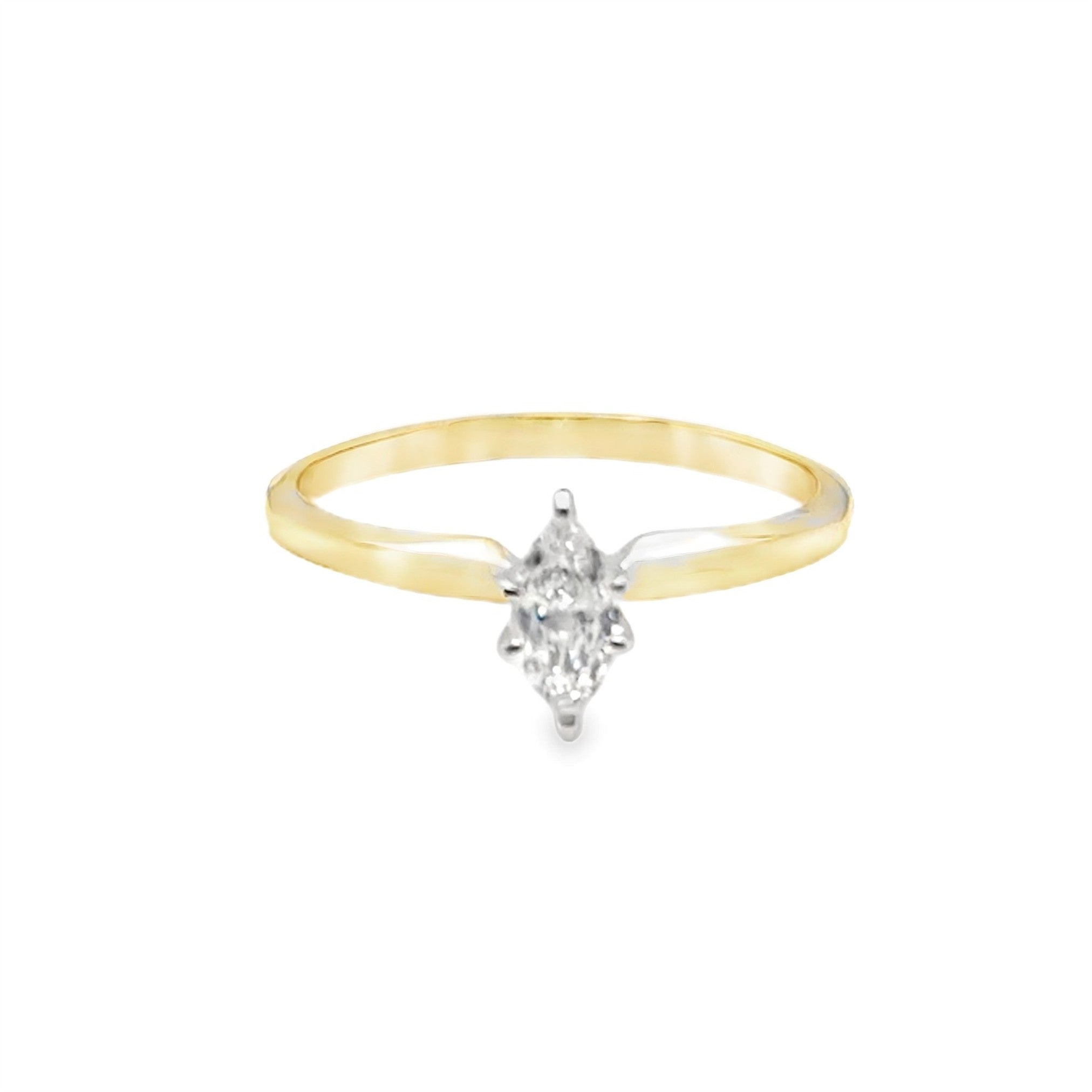 This 14 karat yellow gold ring features (1) 6.3 x 3.3 mm marquise-cut diamond. The diamond weighs approximately 0.33 carats with characteristics G color and SI2 clarity. Finger size 6.25. Stamped "14K."