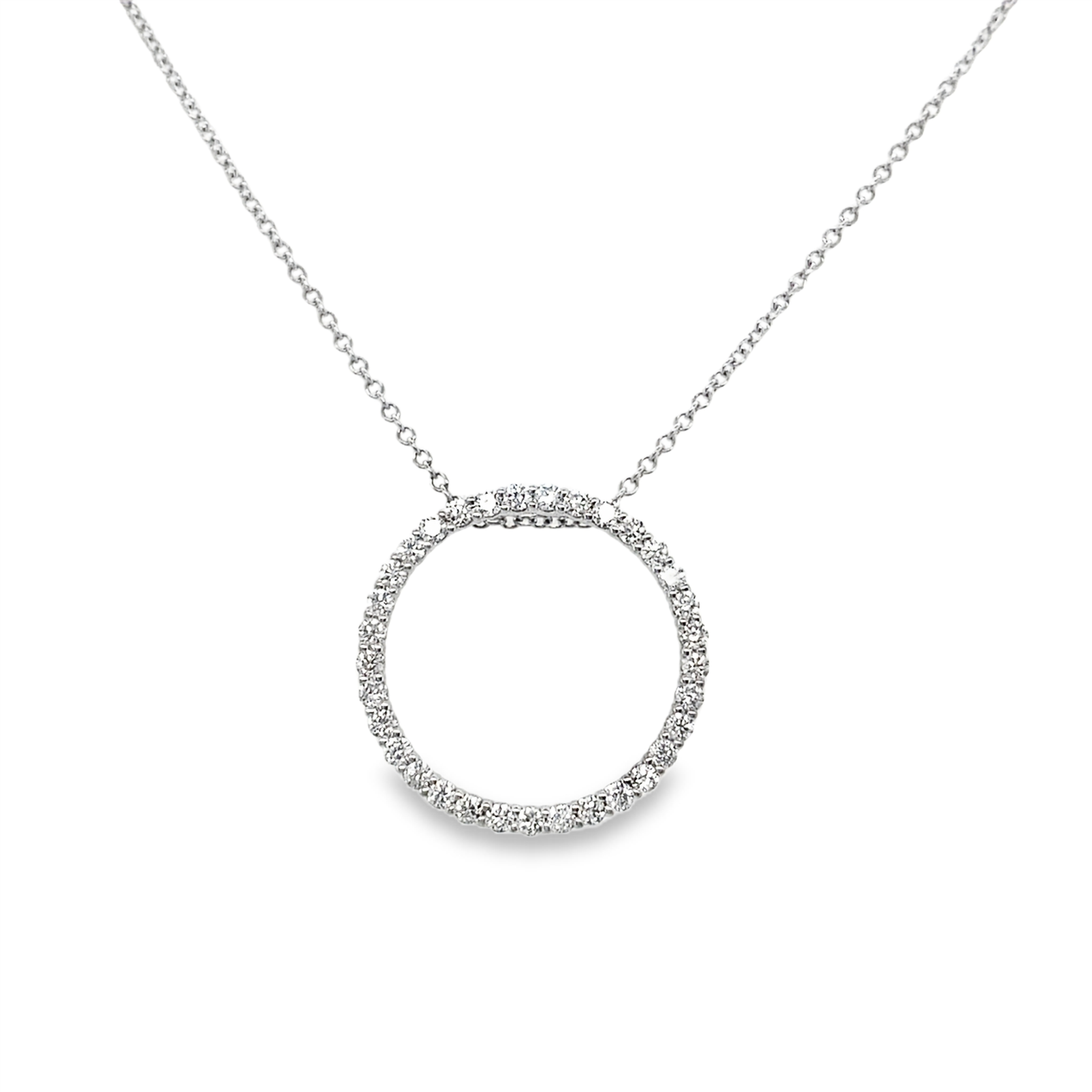 This 14-karat yellow white pendant features (33) round prong-set diamonds in a circle motif. The diamonds have a combined weight of 0.50 carat and quality characteristics of G/H color and SI clarity. Fashioned on a cable chain with a length of 18 inches. Finished with a lobster claw clasp. Stamped "14K".