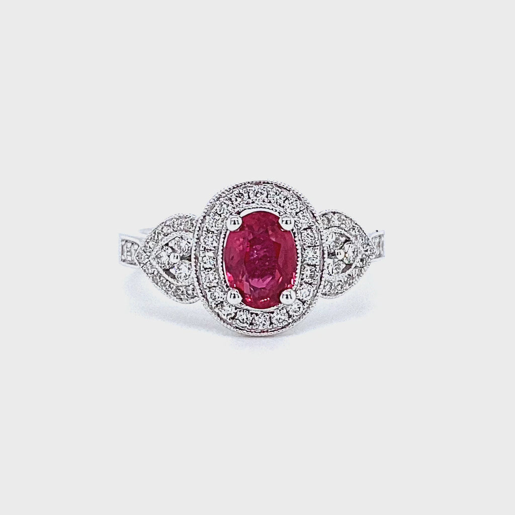 0.39 tdw Oval Passion Ruby & Diamond Milgrain Halo Ring Platinum.