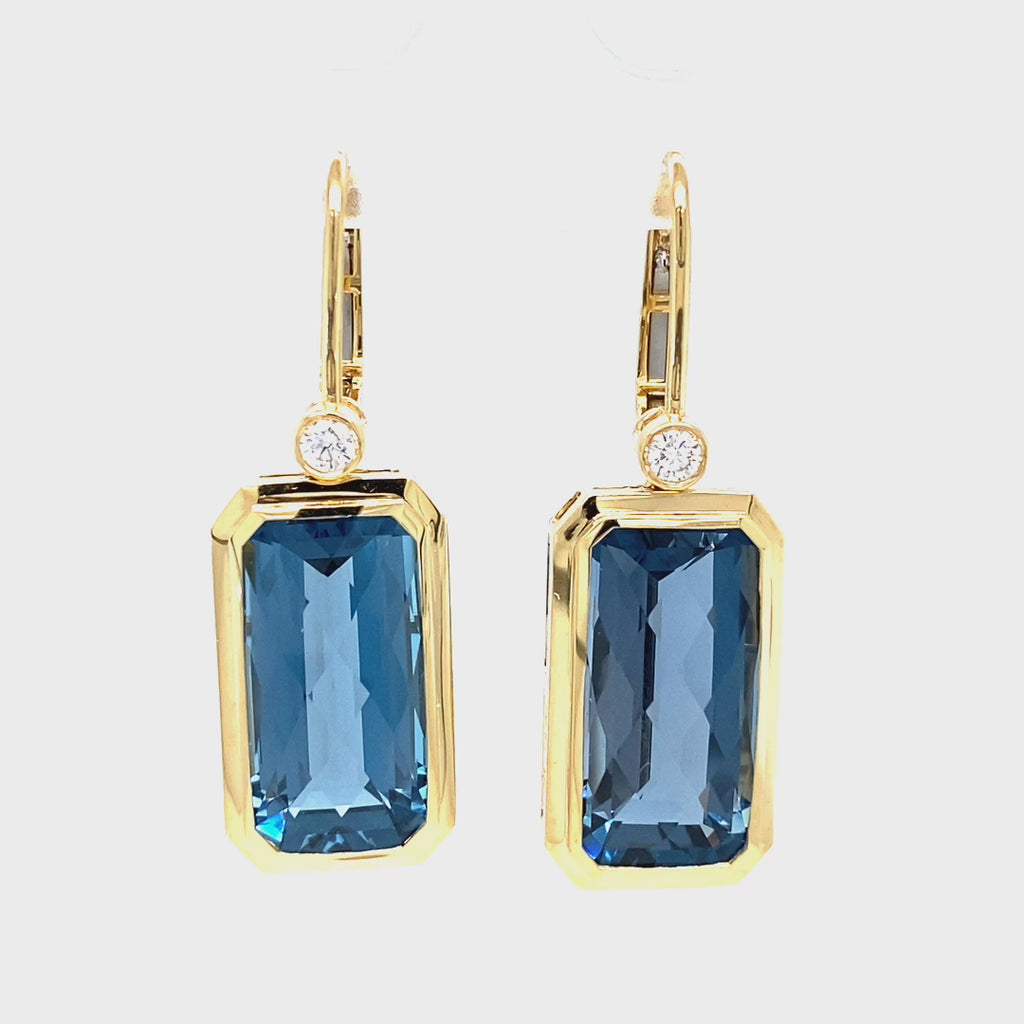 This pair of 18-karat yellow gold dangle earrings features (2) checkboard emerald-cut blue topazes with a combined weight of 20.53 carats. It also features (2) round diamonds with a combined weight of 0.15 carat and quality characteristics of G/H color and SI1 clarity. Fashioned with leverbacks. Stamped "18K".