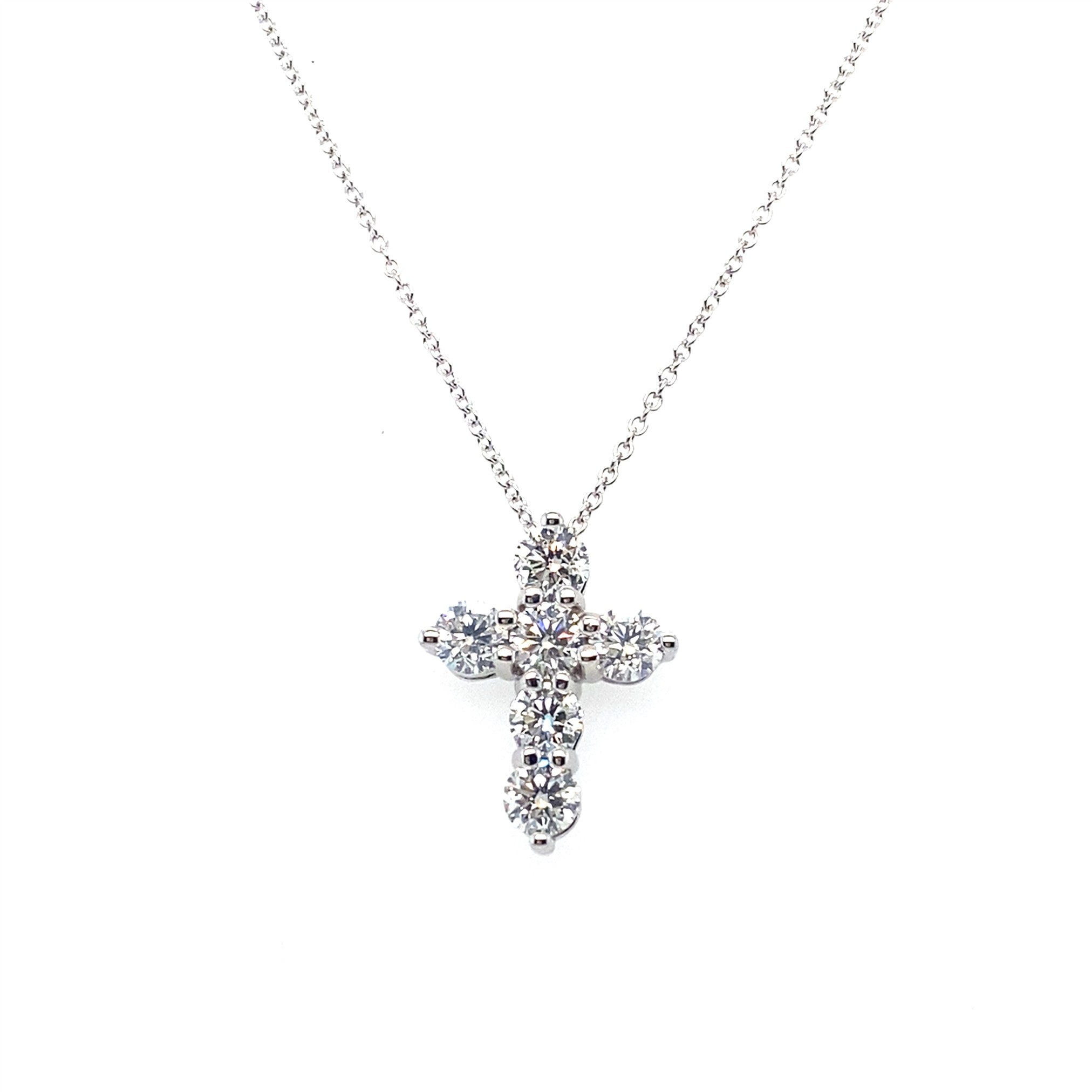 This 14-karat white gold cross pendant features (6) round prong-set diamonds with a total combined weight of 1.55 carat and quality characteristics of G color and SI1 clarity. Chain length is 18 inches. Stamped "14K".