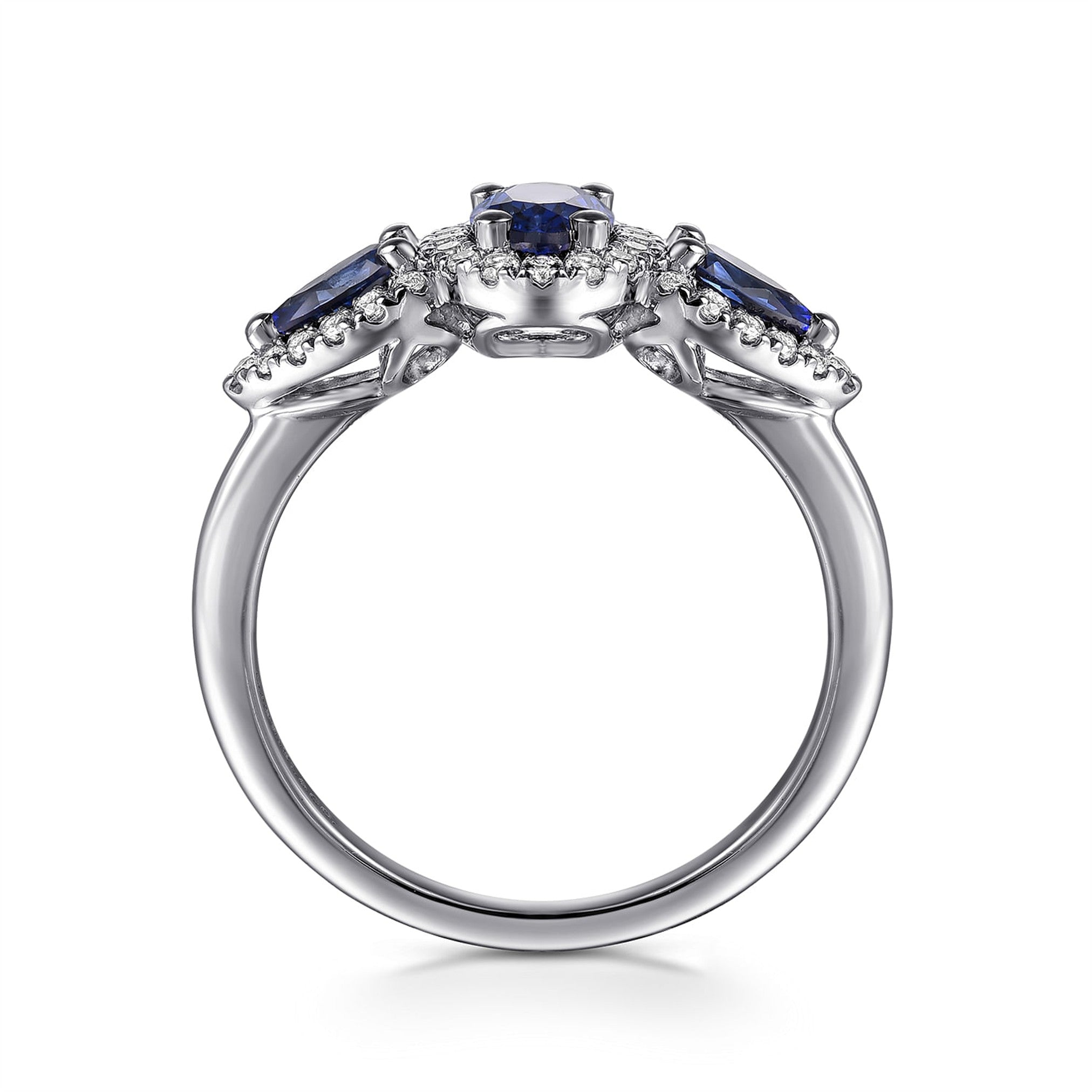 This 14-karat white gold ring features (2) pear-shaped sapphires and (1) oval-shaped sapphire for a combined weight of 1.09 carat, A quality. Each sappphire is surrounded by a halo of round diamonds. The diamonds have a combined weight of 0.26 carat, H/I color, SI2 clarity. Finger size 6.5. Stamped "14K".