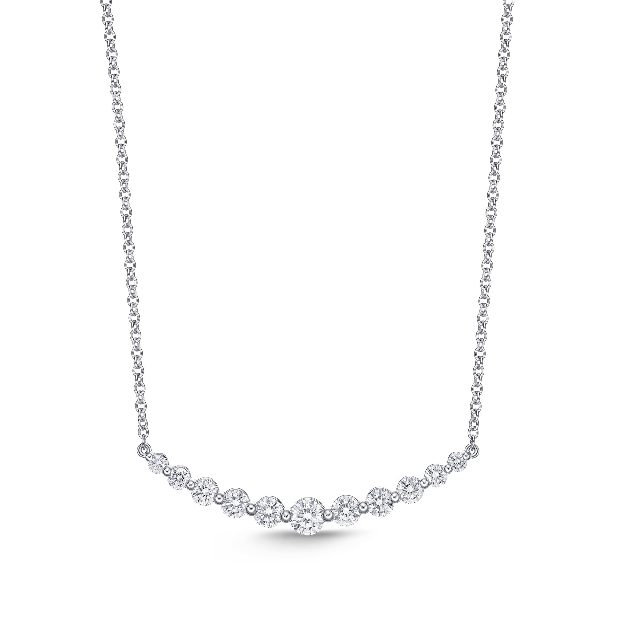 This 18-karat white gold necklace features (11) round prong-set diamonds in a "smile" shape. The diamonds have a combined weight of 1.04 carats, GH color, SI clarity. Total length is 18 inches. Finished with a lobster claw clasp. Stamped "750".