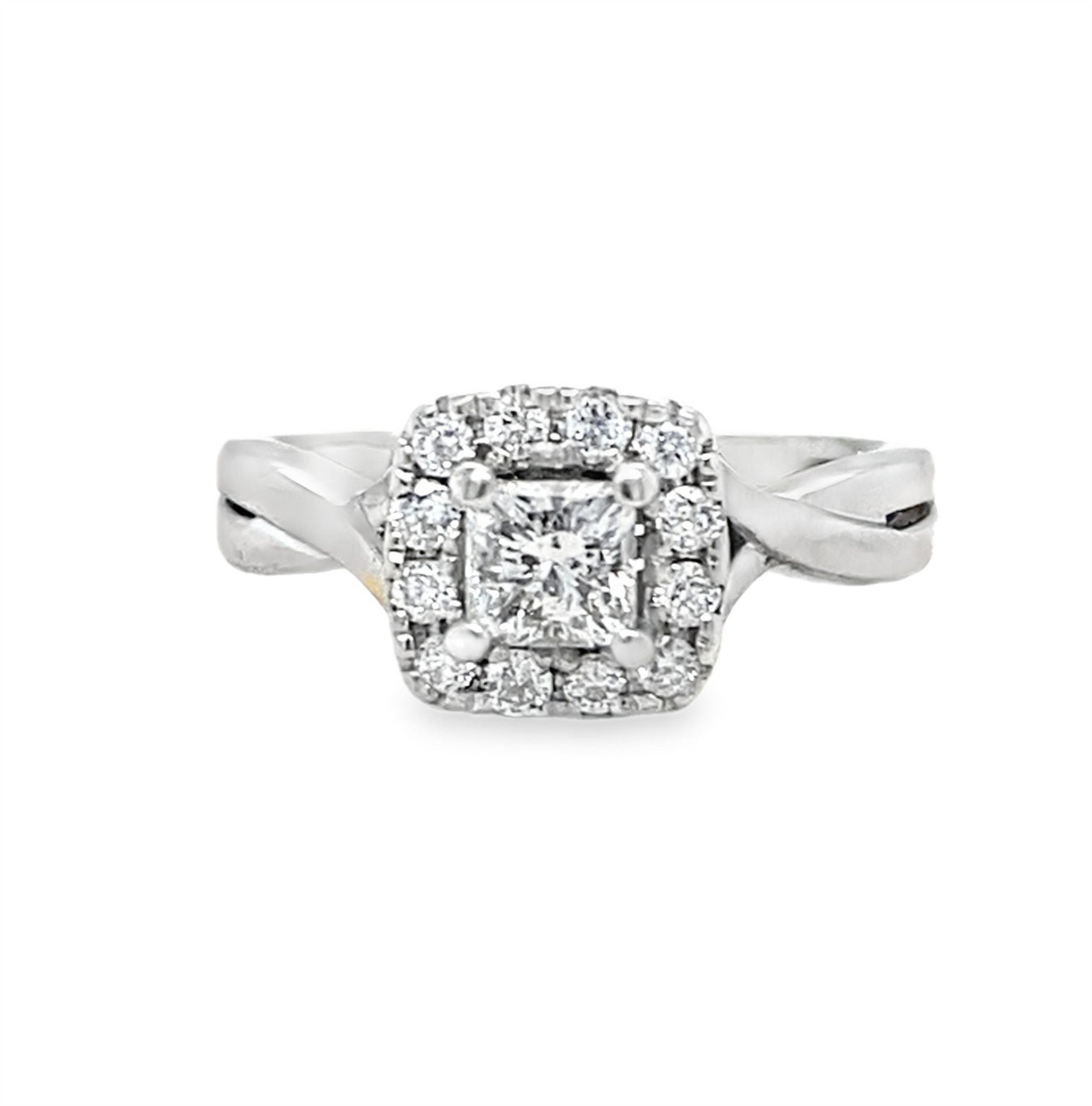 This 14-karat white gold ring features (1) 4.3mm princess cut diamond surrounded by a halo of (12) 1.3mm round diamonds. The center diamond weighs approximately 0.47 carats with quality characteristics H color and SI1 clarity. The side diamonds each weigh approximately 0.01 carats for a total diamond weight of 0.12 carats with quality characteristics G/H color and SI clarity. Ring shank features a twist design. Finger size 7. Stamped “14K.”