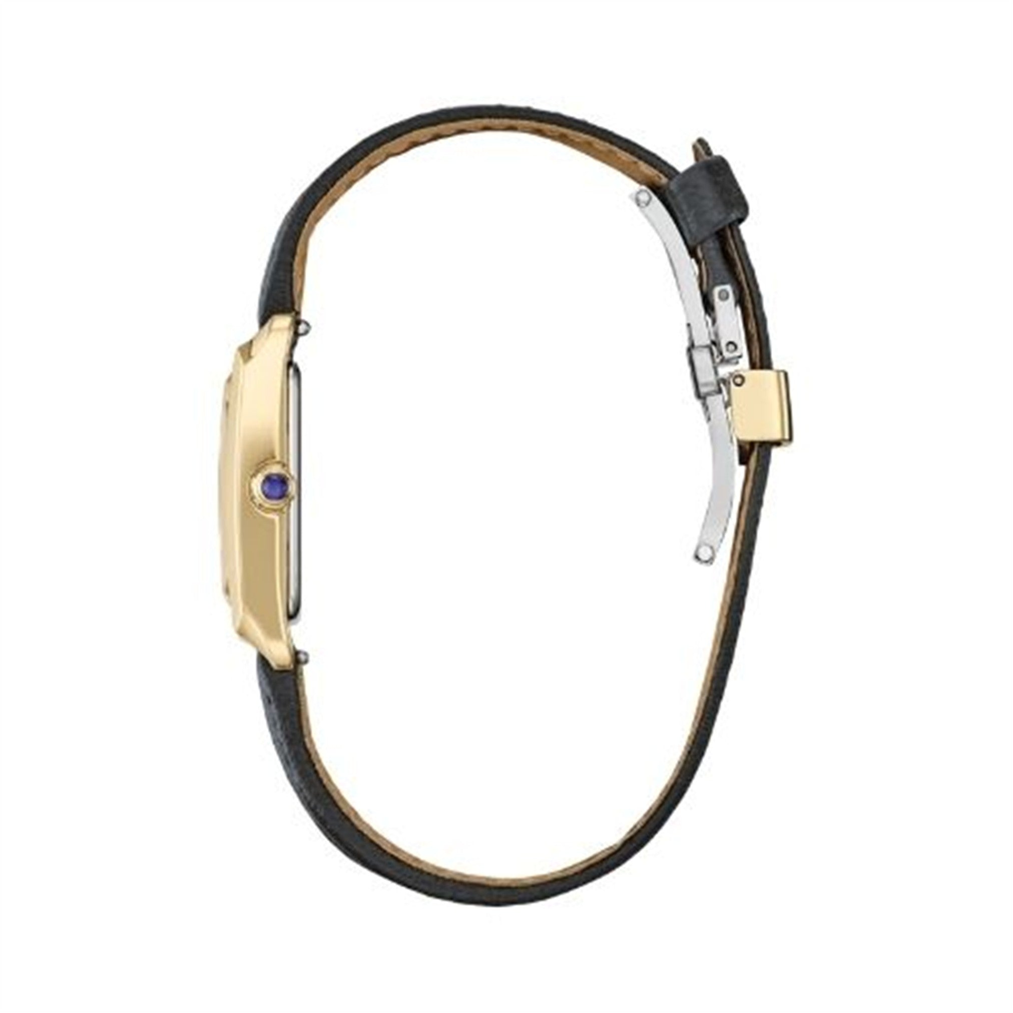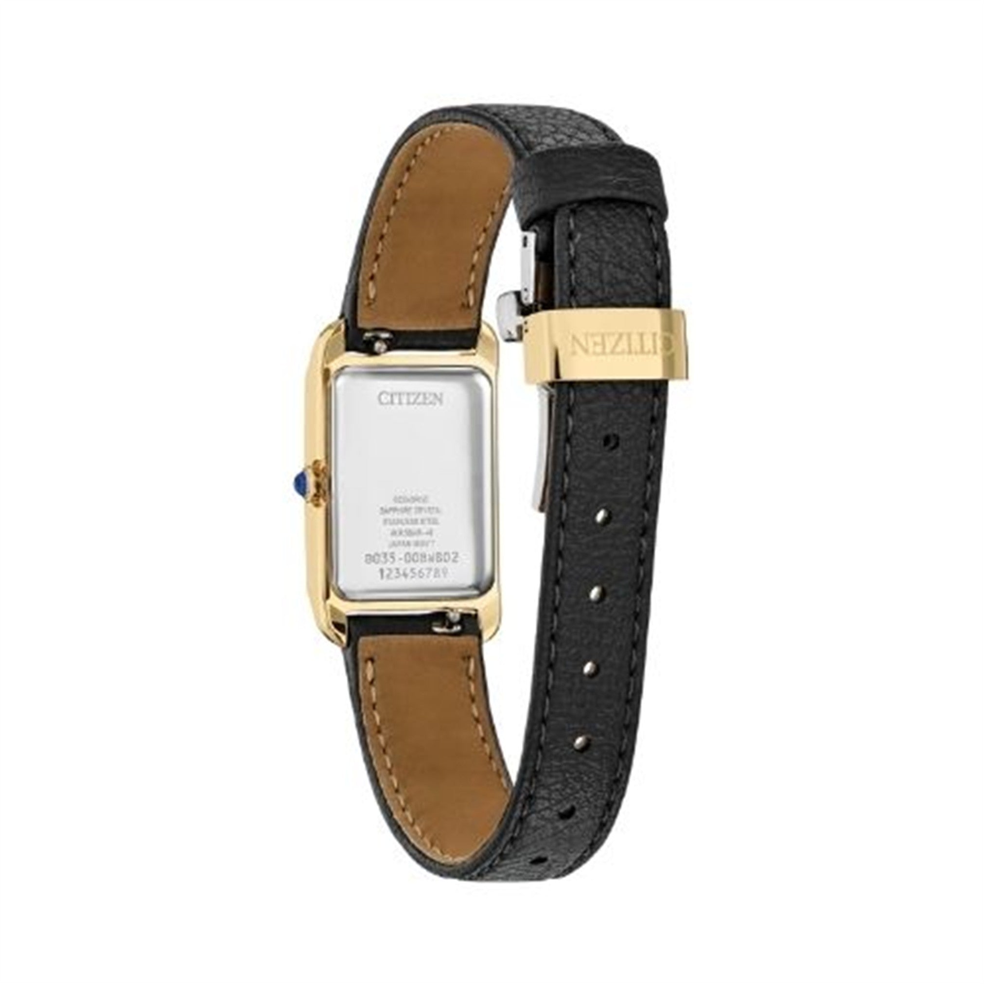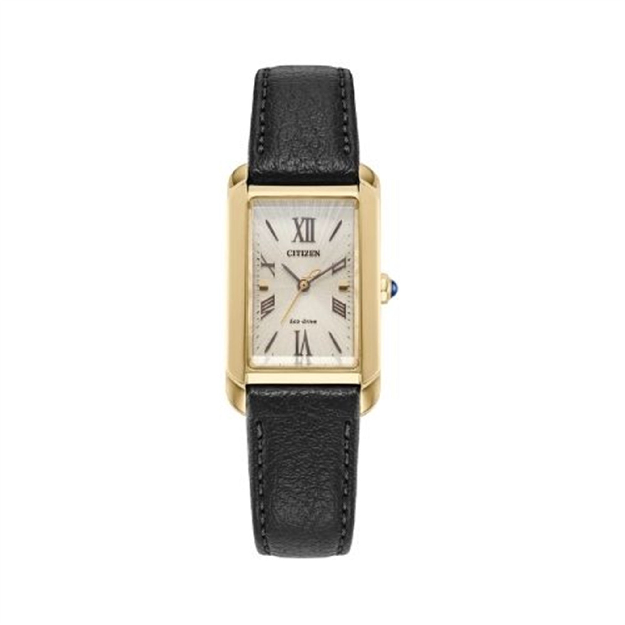 Classic lines and subtle sophistication make this latest piece to our women's collection, the Citizen L Bianca, a charming addition of sustainable luxury. With a design inspired and celebrating feminine motifs in art deco, the distinctive gold-tone stainless steel case features a subtle synthetic sapphire on its crown for a captivating look. A curved rectangular shape defines the watch’s 32.4mm silhouette, with a black leather strap rounding out the look.