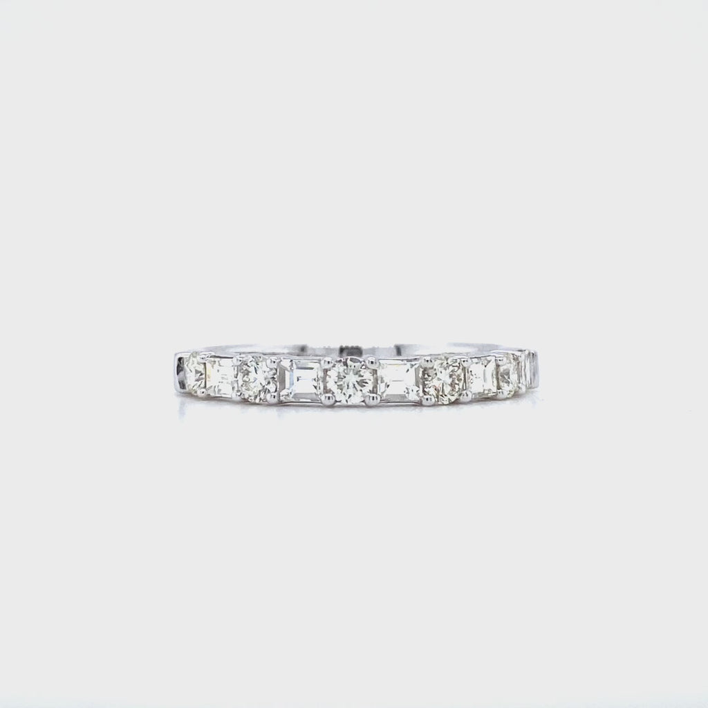 This 14 karat white gold diamond wedding band is prong set with (5) round brilliant and (10) baguette diamonds across the top profile with a combined weight of 0.72 carat and quality characteristics of I color and SI1 clarity. Finger size 7.5. Stamped "14K".