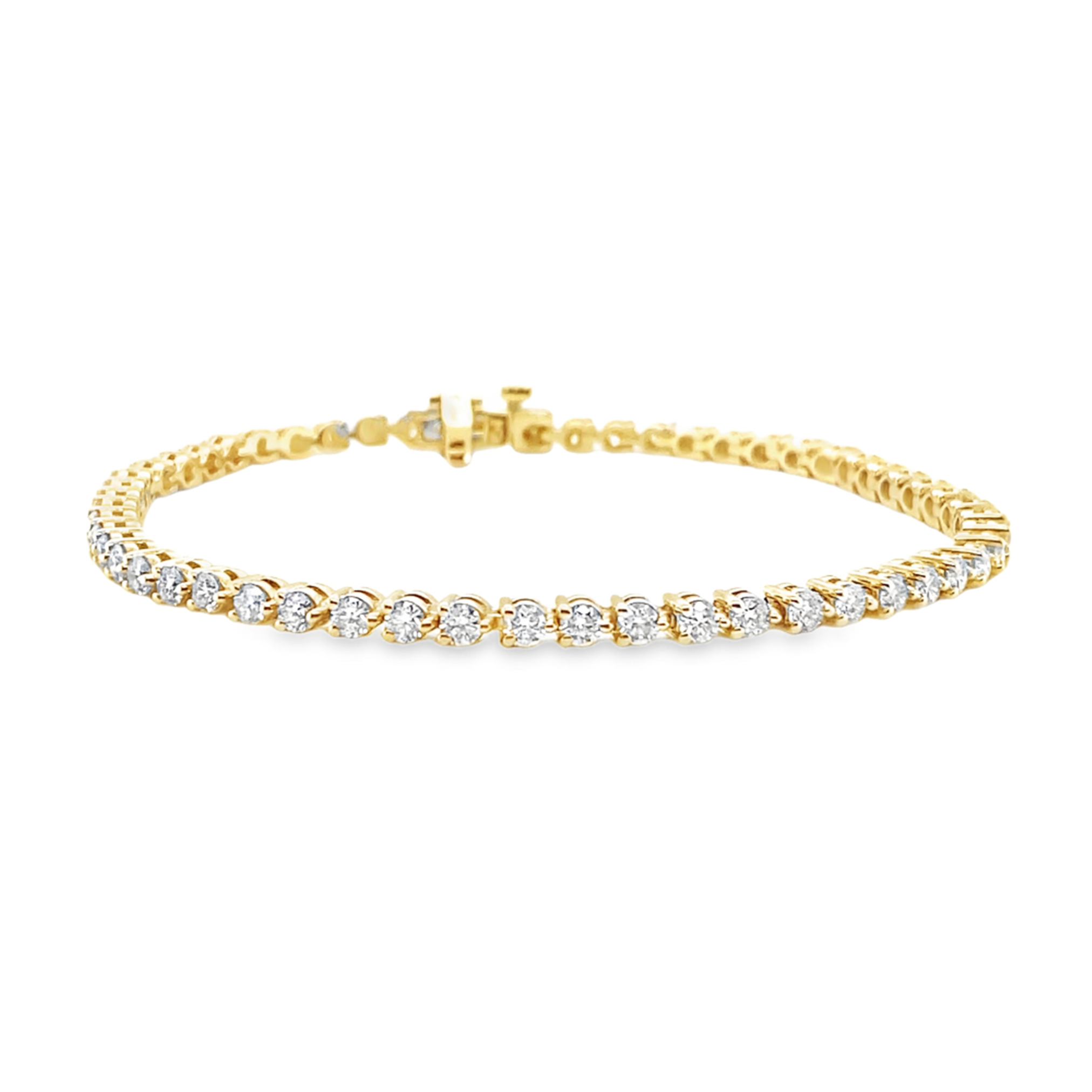 This 14-karat yellow gold line bracelet features (56) round diamonds in 3-prong settings. The diamonds have a combined weight of approximately 3.15 carats and quality characteristics of H color and SI2-I1 clarity. Length is 7 inches. Finished with an open box clasp. Stamped "14K".