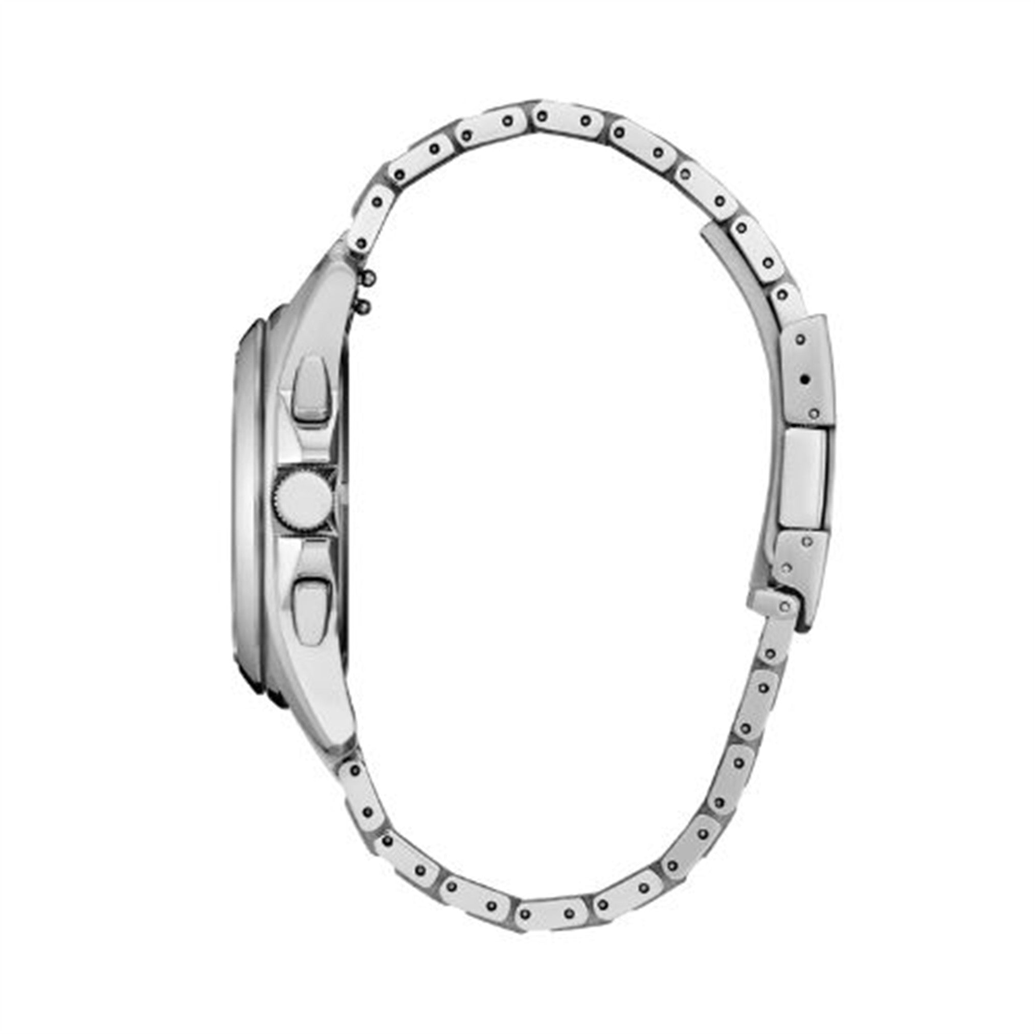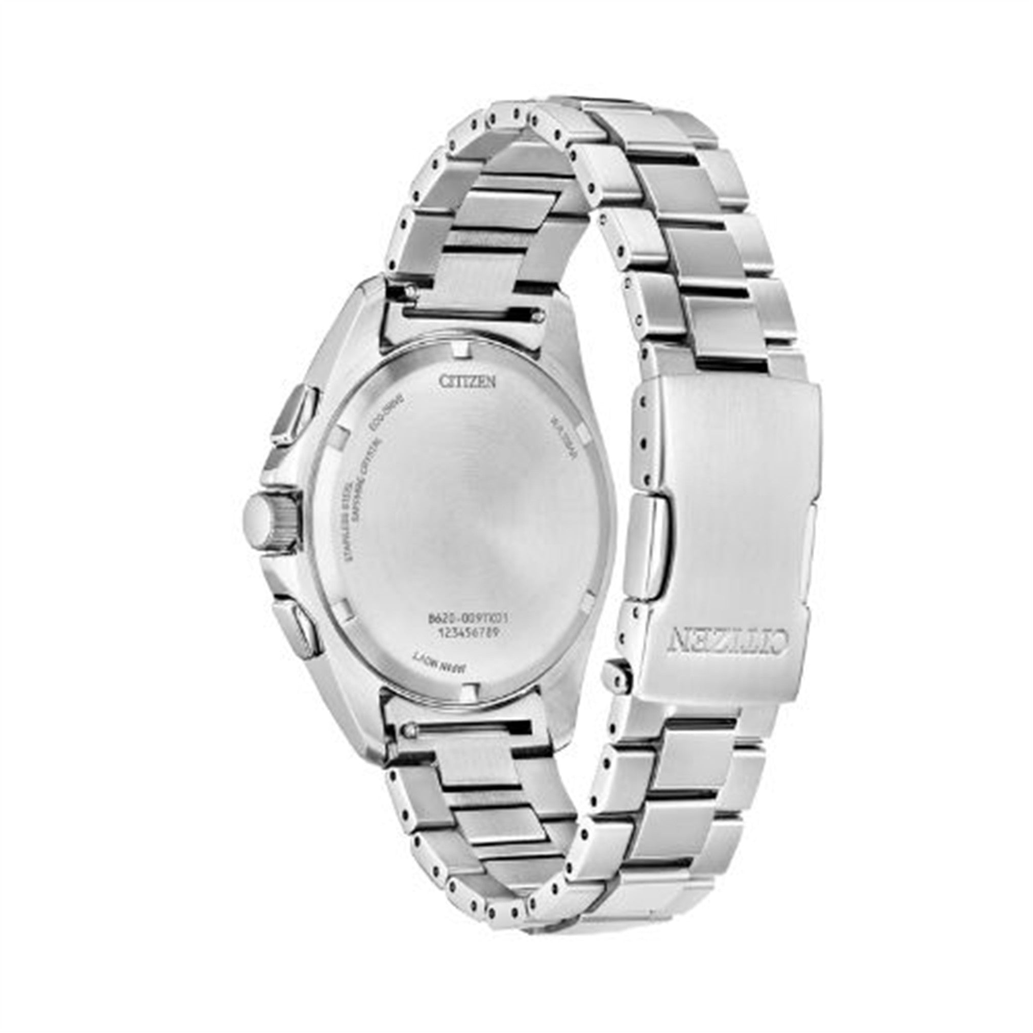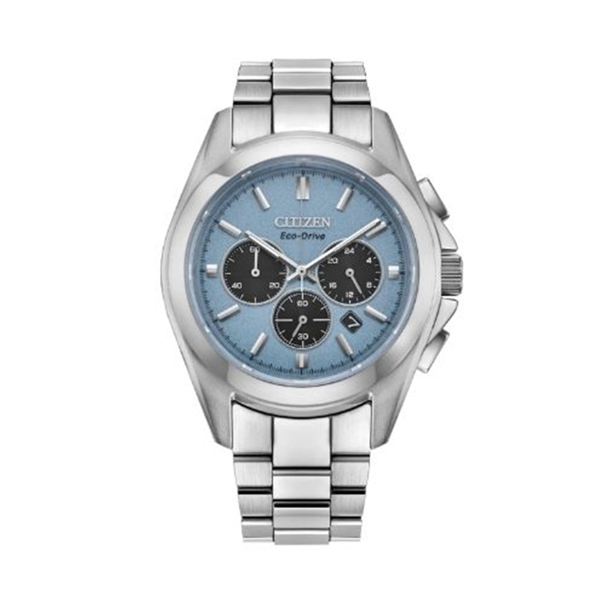 Make a distinctive style statement that's ready for action with this new Sport Luxury chronograph. The 40.5mm silver-tone stainless steel case holds a sunray light blue dial with a 1/5 second chronograph that measures up to 60 minutes, 12/24-hour time, and date. The sleek dial is accented with black registers, and finished with a sapphire crystal. The silver-tone stainless-steel bracelet has a fold over clasp with push buttons, giving the timepiece a secure, understated refinement. This Eco-Drive watch is sustainably powered by any light source, eliminating the need for batteries, and is water resistant up to 100 meters. Caliber B620.