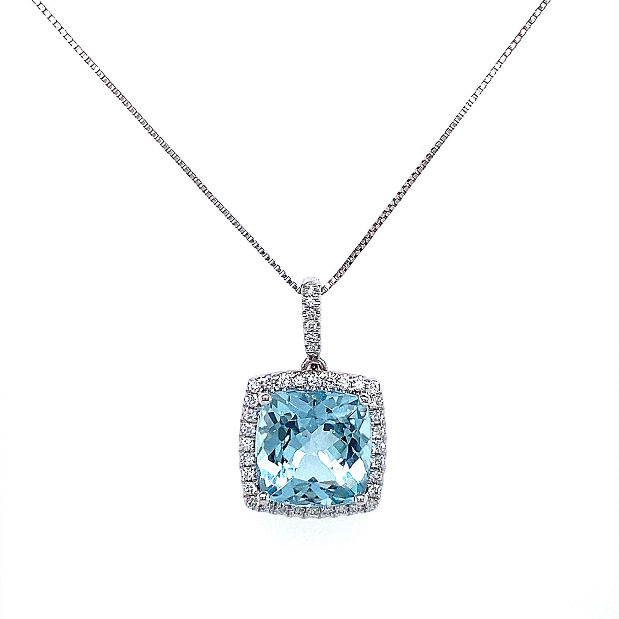 0.22 tdw 10 mm Cushion Cut Aquamarine & Diamond Pendant 14K White Gold.