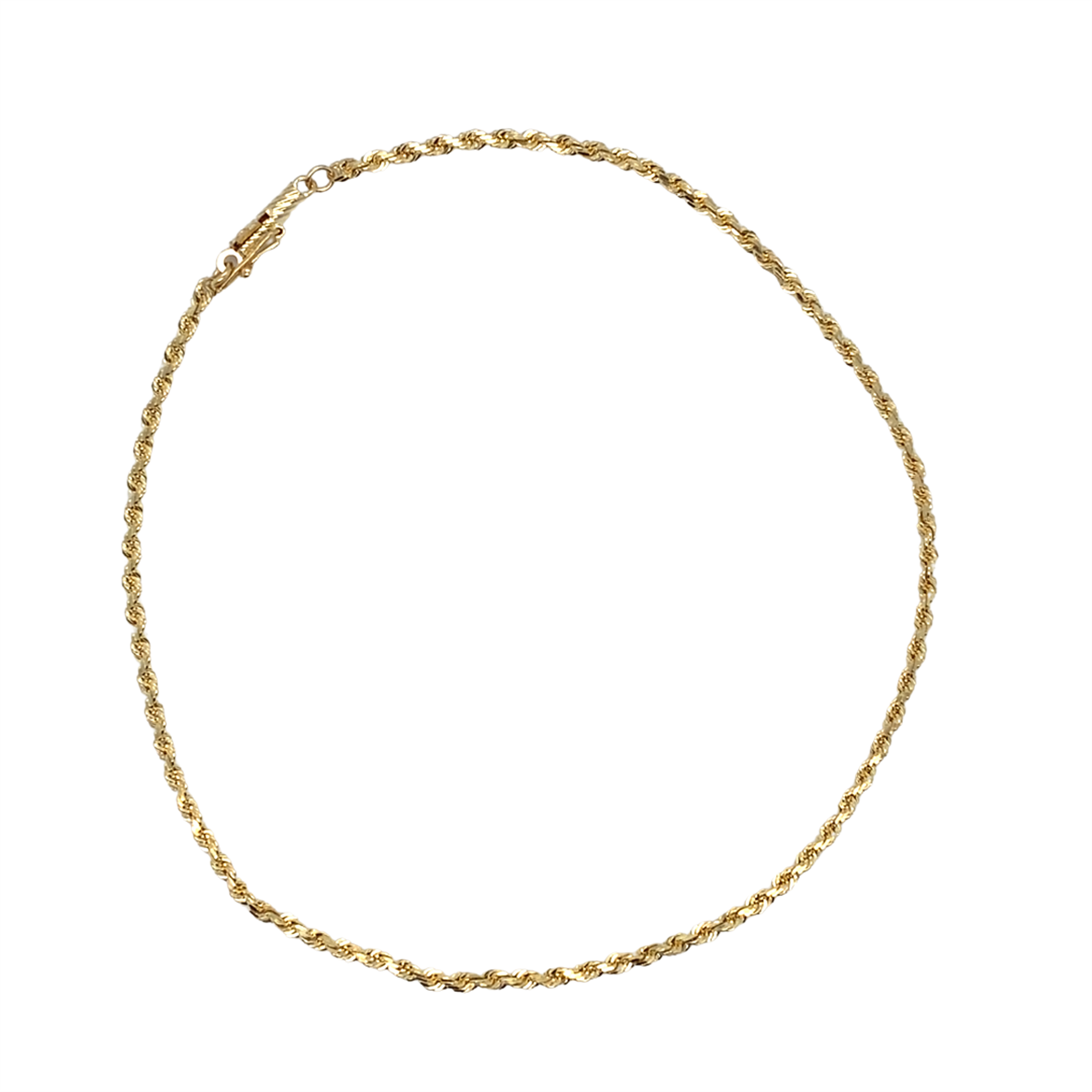 This 14 karat yellow gold 1.9 mm diamond cut rope chain anklet measures 9 inches in length and is secured with an engraved barrel clasp and safety catch.