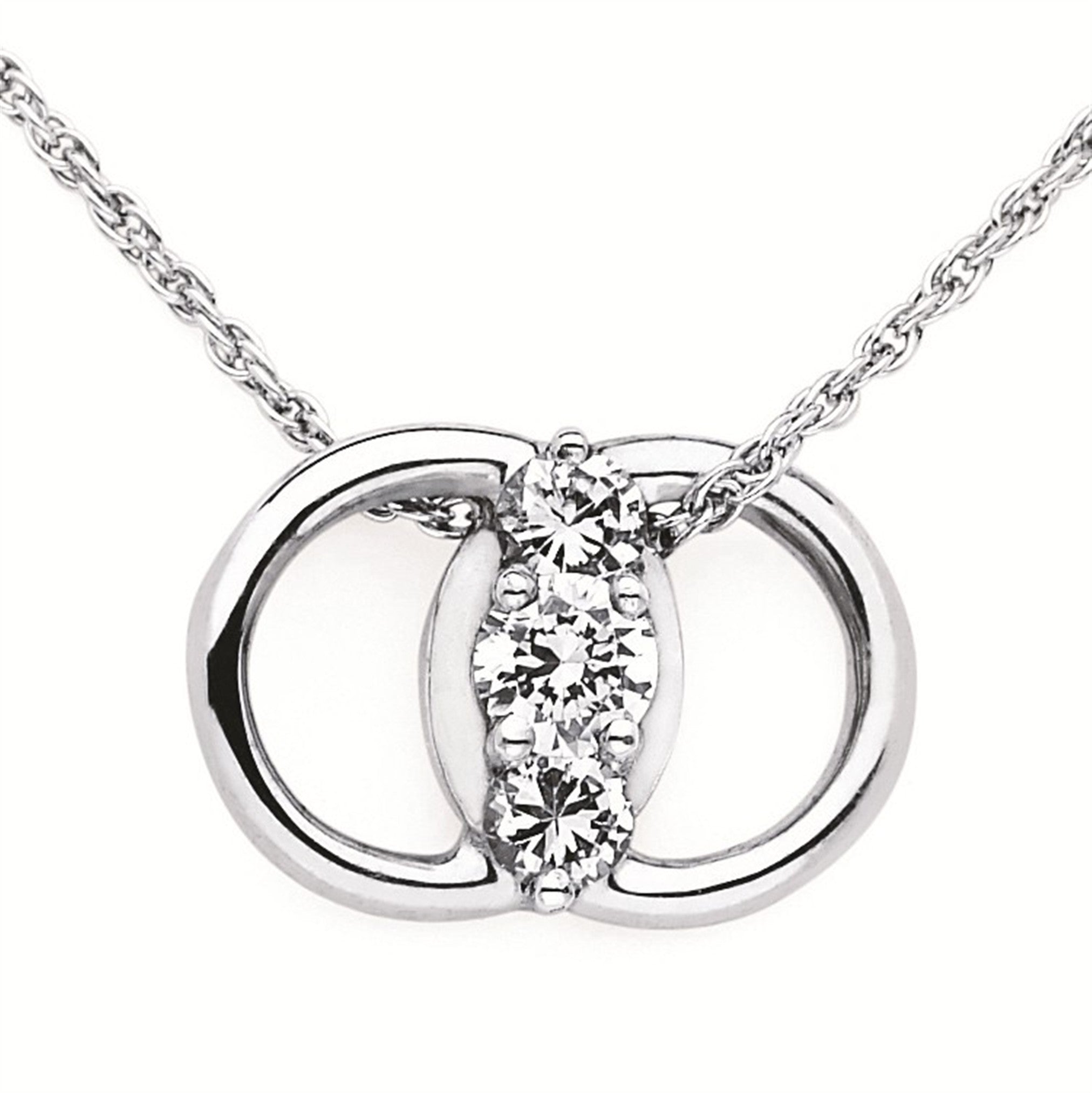This 14-karat white gold marriage symbol pendant features (3) round prong-set diamonds. The diamonds have a total combined weight of 0.12 carat and quality characteristics of G/H color and SI clarity. Includes an 18-inch fine rope chain finished with a lobster clasp. Stamped "14K".