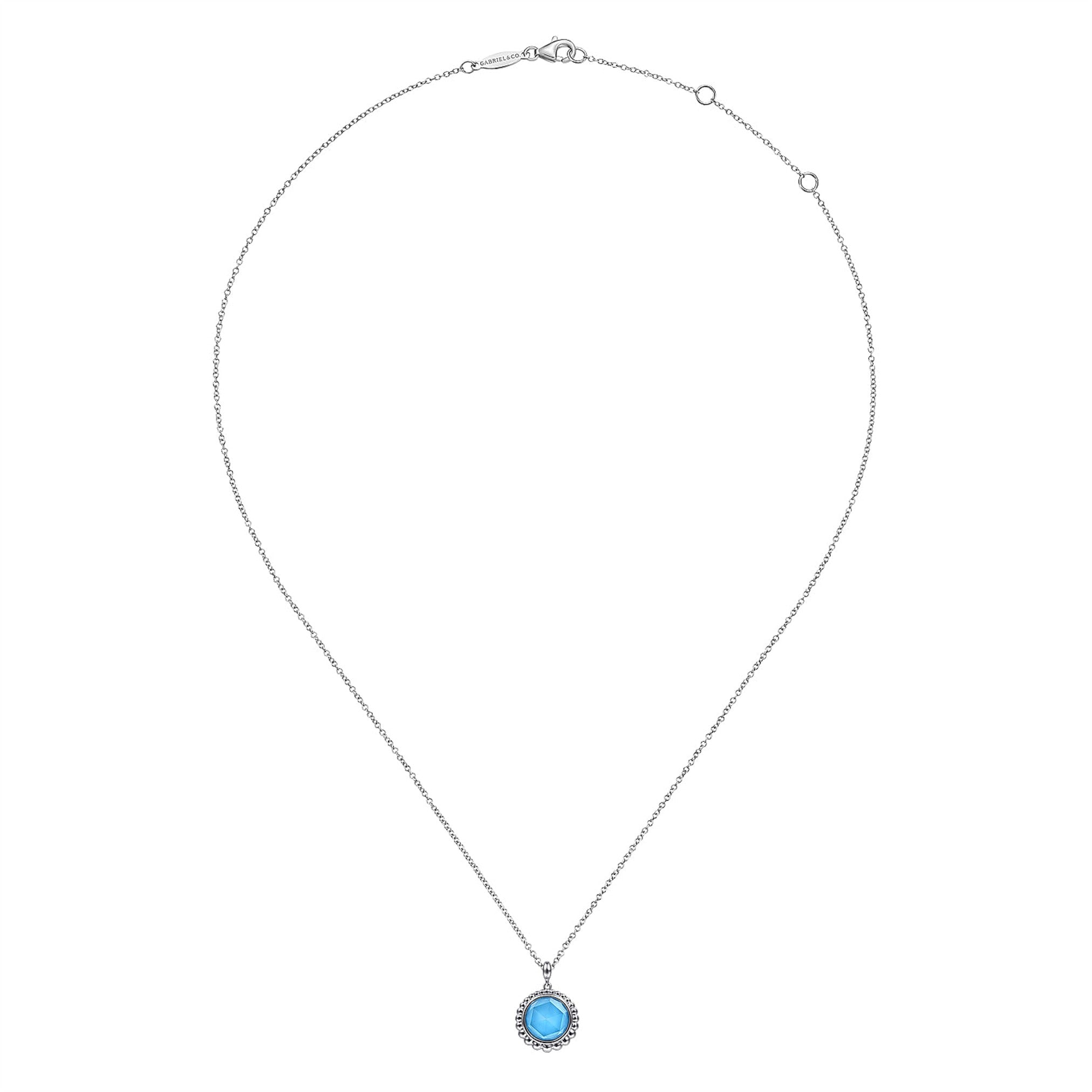 This sterling silver pendant features (1) rock crystal and tourquoise round stone set in a bezel style setting. Fashioned with a sterling silver cable chain with a total length of 17.5 inches. Finished with a lobster claw clasp. Stamped "925".