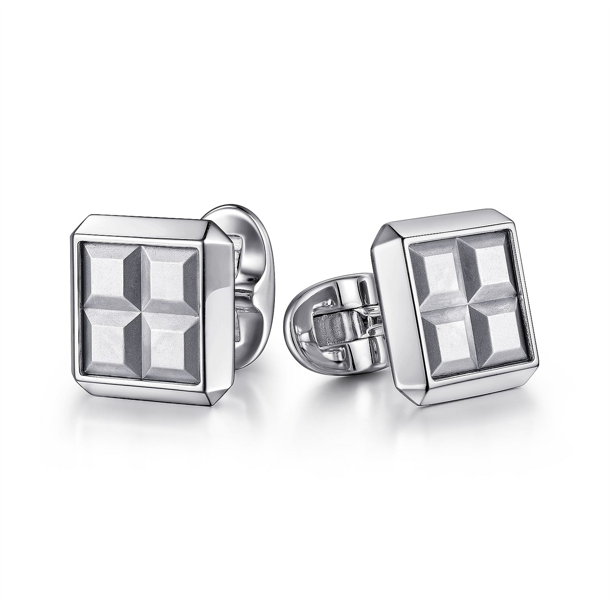 This pair of sterling silver cufflinks features a sharp square silhouette with a quartet of sculpted cubes at the center. Stamped "925".