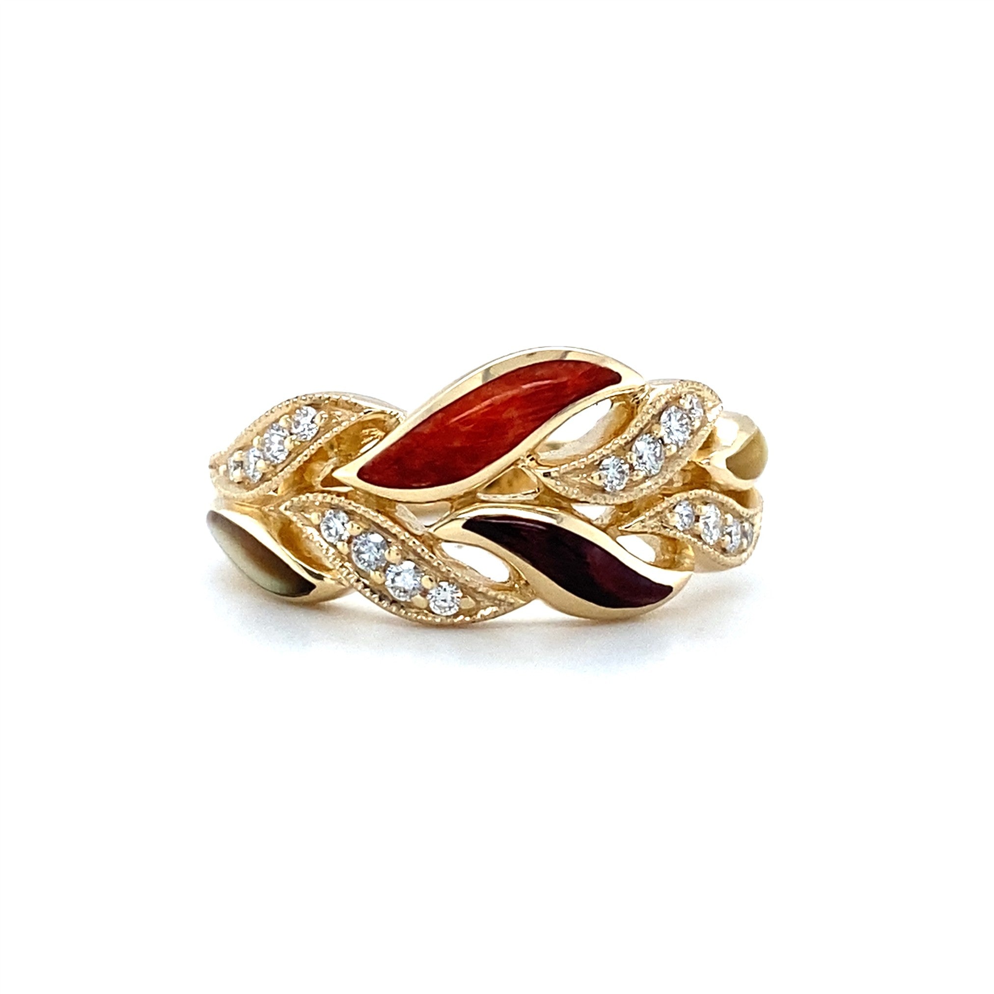 0.19 tdw Mixed Mother Of Pearl & Spiny Oyster Leaf Ring 14K Yellow Gold.