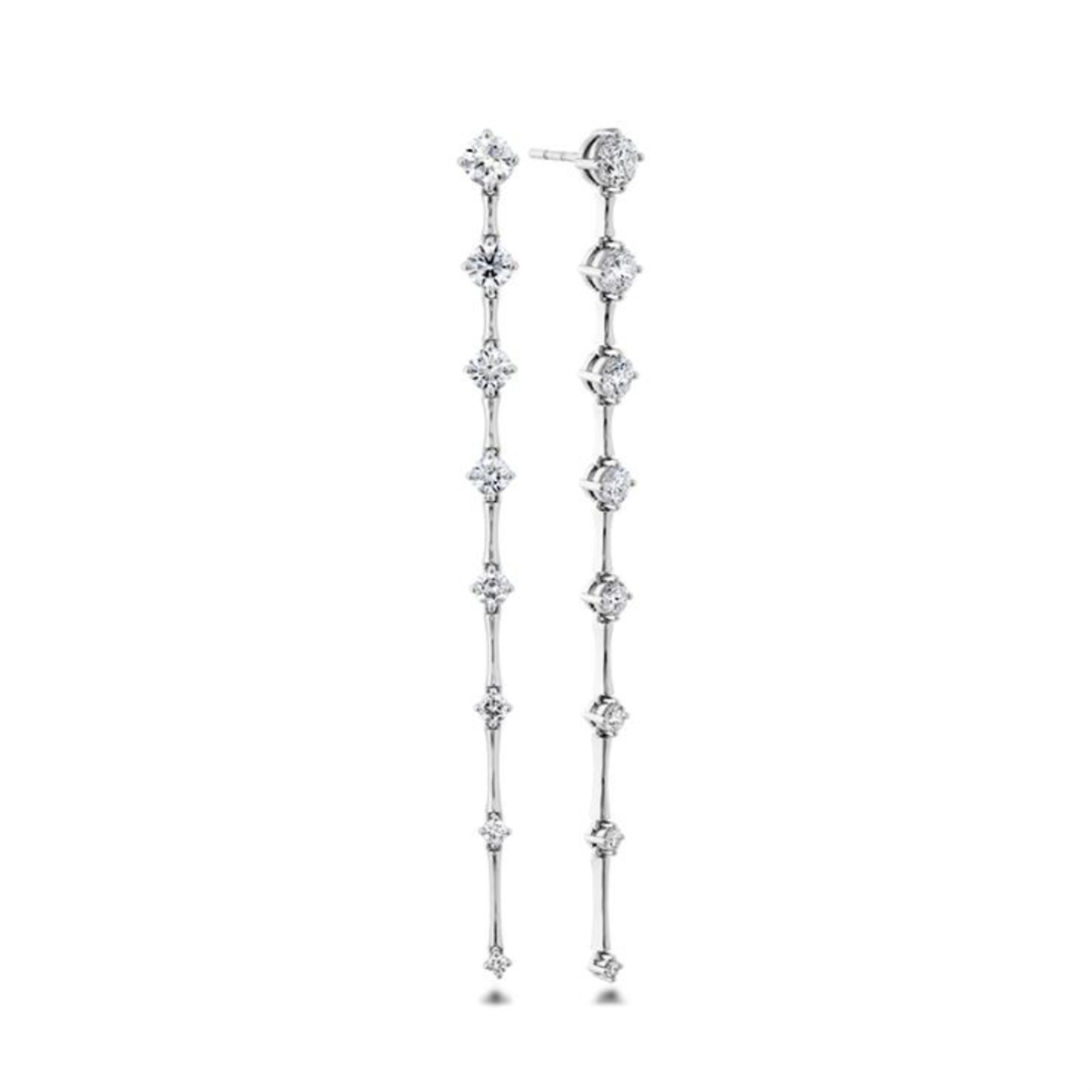 This pair of 18-karat white gold drop earrings features (14) round prong-set with a total combined weight of 1.17 carat and quality characteristics of G/H color and SI clarity. Fashioned with friction posts and pushbacks. Stamped "750".