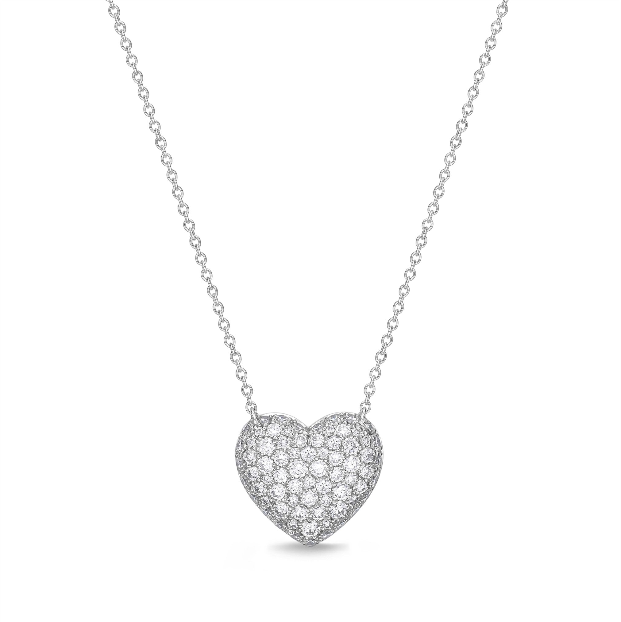 This 18-karat white gold heart pendant features (73) pavé-set round diamonds with a total combined weight of 0.49 carat and quality characteristics of G/H color and SI clarity. Fashioned stationary to a cable chain with a total length of 18 inches. Finished with a lobster claw clasp. Stamped "750".