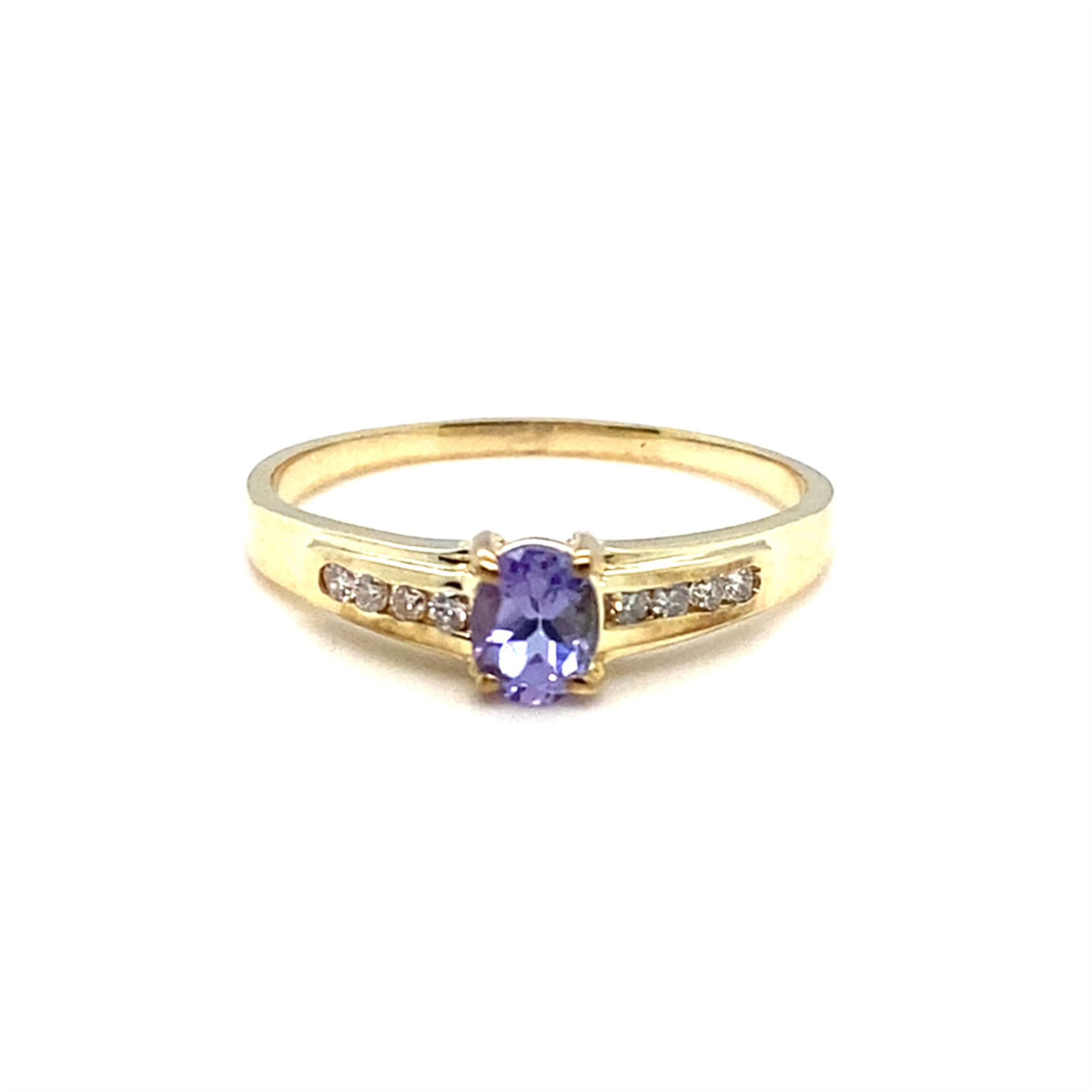 This 14-karat yellow gold ring features (1) prong-set oval tanzanite (8) channel-set round diamonds measuring 1.50 mm. The tanzanite measures approximately 5 x 4 mm and is A quality. The total diamond weight is approximately 0.12 carats with quality characteristics H / I color and SI clarity. Finger size 7.75. Stamped “14K.”